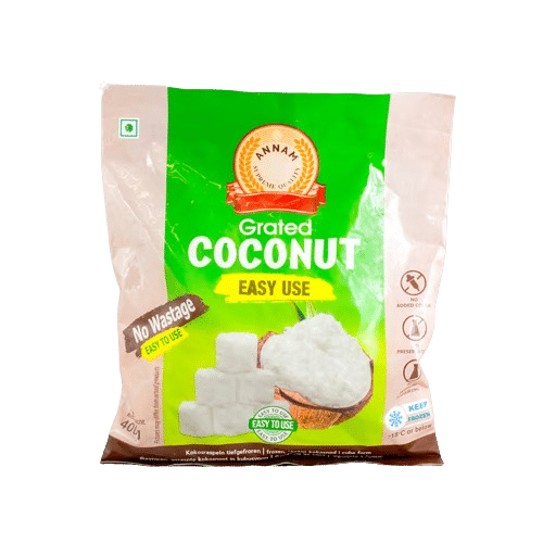 Annam Frozen Grated Coconut Cubes are a convenient and mess-free alternative to traditional grated coconut. Made from freshly grated coconut, these cubes are instantly frozen to preserve their natural taste, aroma, and nutrients. The easy-to-use cube format allows for precise portioning, making them perfect for cooking, baking, and blending into smoothies.