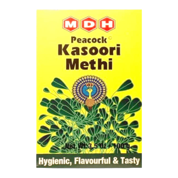 MDH Peacock Kasoori Methi (dried fenugreek leaves) is a premium-quality spice used to enhance the flavor and aroma of various Indian dishes. These dried leaves have a slightly bitter, earthy, and nutty taste, adding depth to curries, dals, and bread like parathas and naans.