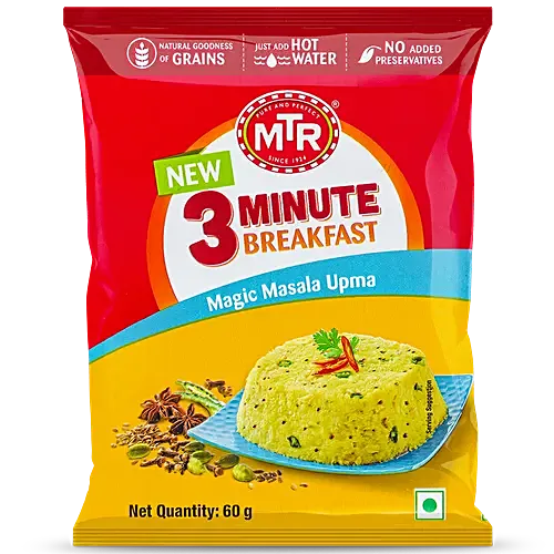 MTR 3-Minute Magic Masala Upma is a quick and convenient instant meal that lets you enjoy the traditional South Indian upma in just 3 minutes. Made with high-quality semolina (rava) and a flavorful blend of spices, this upma is mildly spicy, aromatic, and perfectly textured. It is an ideal breakfast or snack option for those looking for a fast yet tasty meal. Just add hot water, stir, wait for 3 minutes, and enjoy!